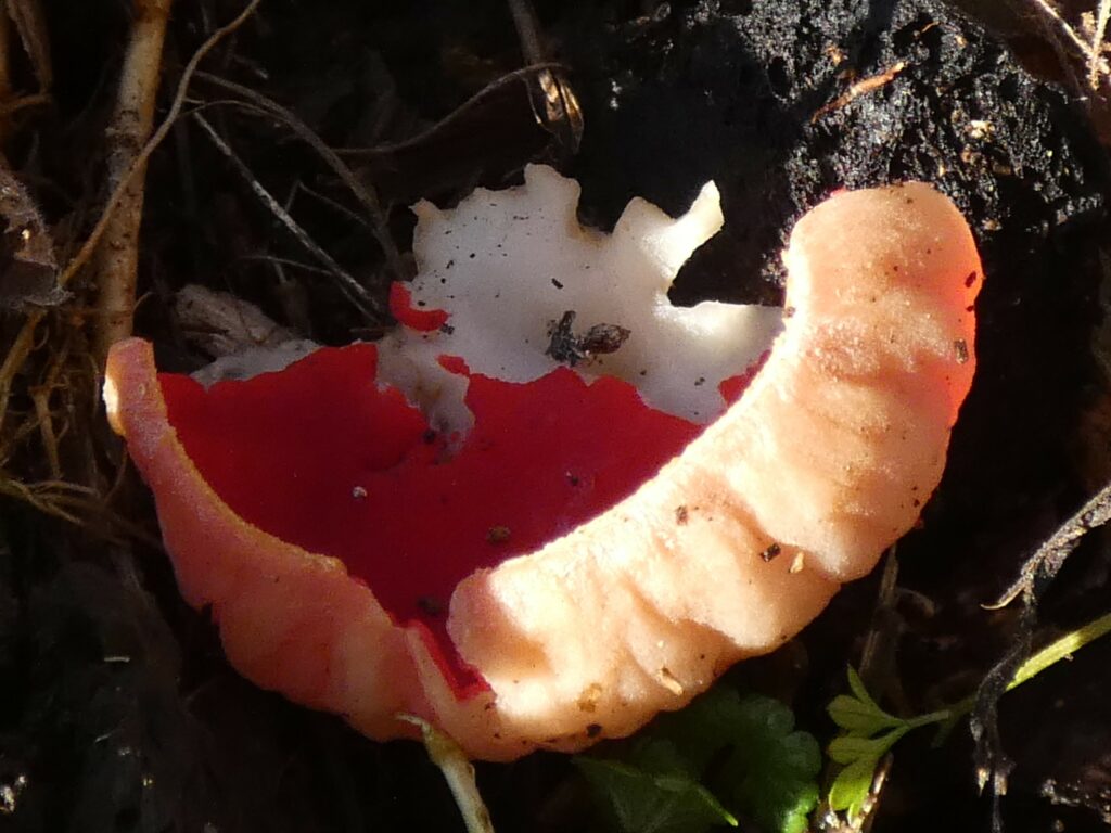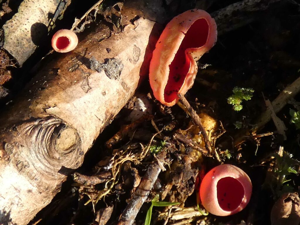 Ook in de winter kun je op onze terreinen paddenstoelen vinden. Op de Snoek staat al een paar jaar de rode kelkzwam s.l. Dat s.l. geeft aan dat je niet kunt zeggen om welke roodkleurige kelkzwam het precies gaat, tenzij je de sporen onder de microscoop bekijkt. Deze zwam komt voor op dood hout. Blijkbaar zijn er dieren die deze zwam lekker vinden, want er staan verschillende aangevreten exemplaren.